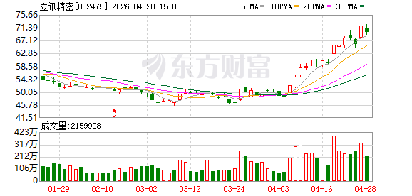4月27日,立讯精密盘中最高触及72.6元/股,总市值突破5200亿元,再次创下历史新高。截至当日收盘,立讯精密报71.97元/股,涨9.05%,总市值约为5244亿元,较前一交易日收盘暴增434.97亿元。