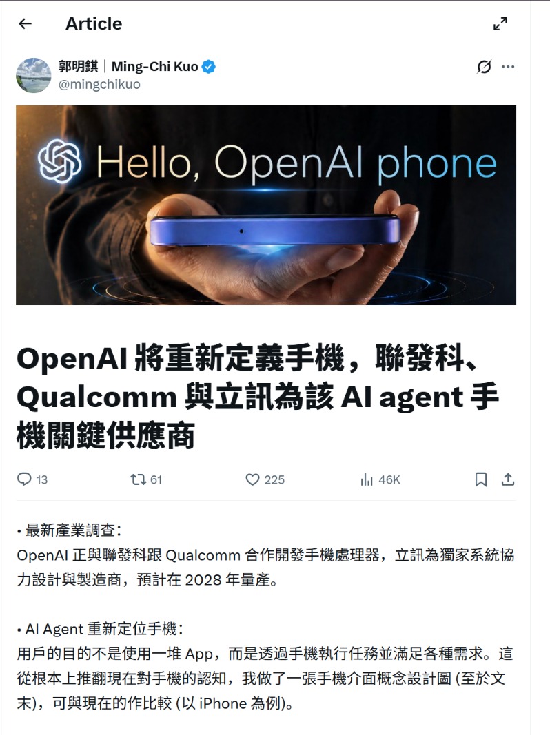 郭明錤表示,无论立讯如何努力,在苹果供应链的整机组装地位上都很难超越鸿海;正因如此,获得OpenAI手机独家系统协力设计与制造商身份,对立讯具有非同寻常的战略价值。郭明錤认为,立讯有望凭借此次提前布局,在下一个手机世代确立领先的受益者地位,实现苹果供应链之外的重要增长支点。