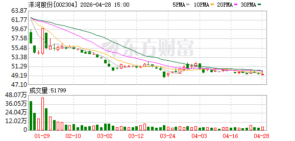 截至4月27日收盘,洋河股份报49.43元/股,跌0.88%。