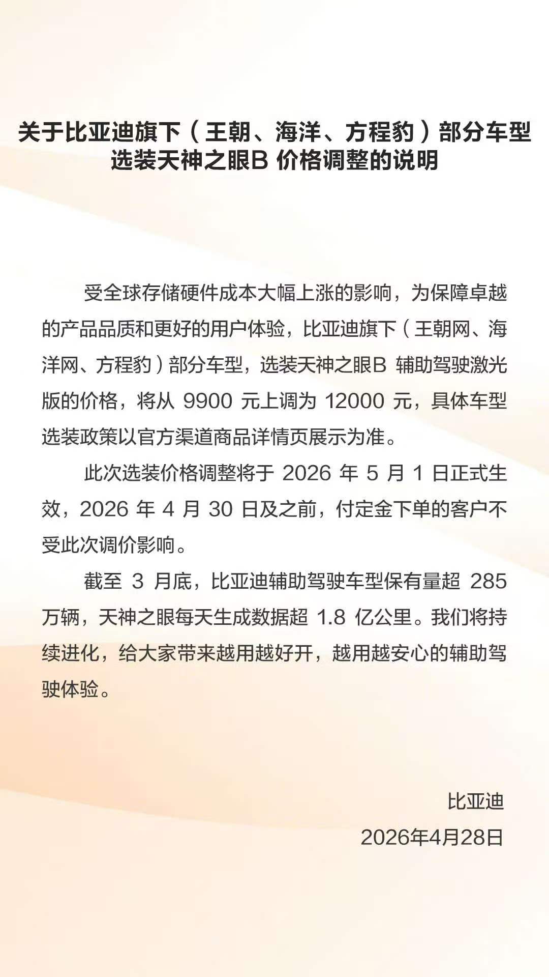 4月28日晚,比亚迪宣布,5月1日起,旗下王朝、海洋、方程豹品牌部分车型,选装“天神之眼B辅助驾驶激光版”的价格将从9900元调整为12000元,涨幅2100元。4月30日及之前支付定金的客户不受此次调价影响。比亚迪在公告中解释,此次调价主要原因是受全球存储硬件成本大幅上涨的影响。