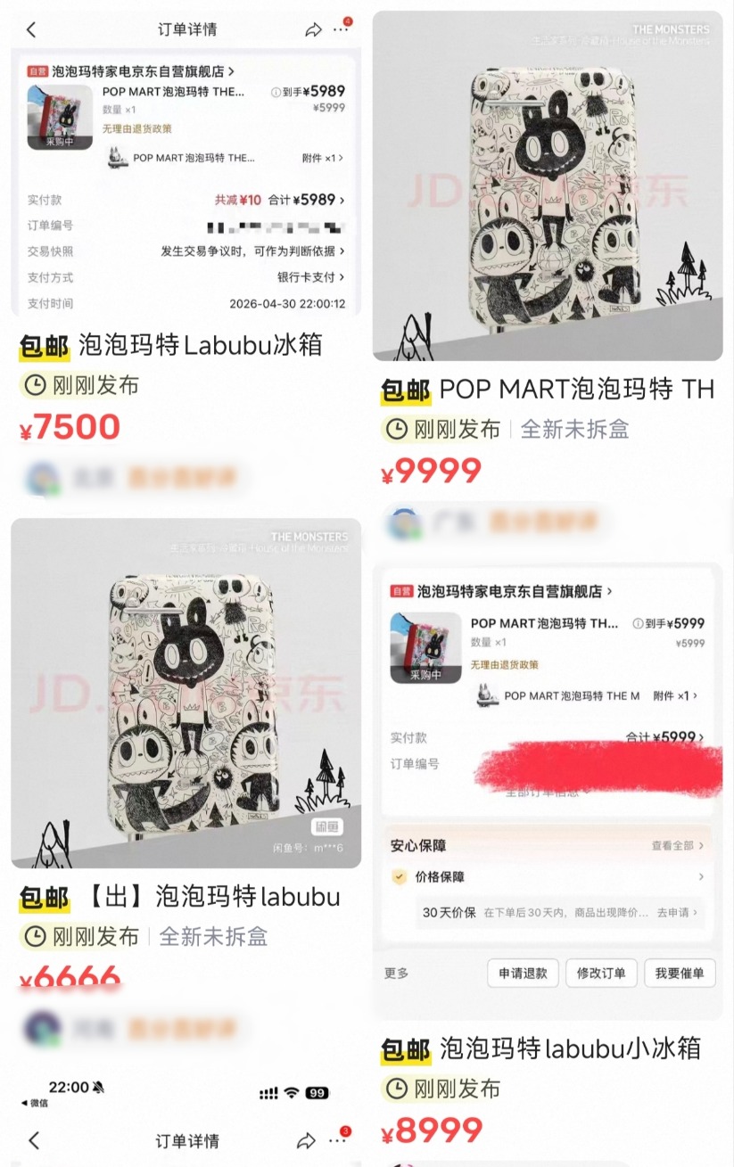 随后,闲鱼平台迅速出现了泡泡玛特冷藏箱的二手转卖链接,加价幅度在1000元至4000元不等。一位给Home款冷藏箱标价8999元的卖家告诉红星资本局,自己抢到了该款冷藏箱,按标价出,不接受砍价。