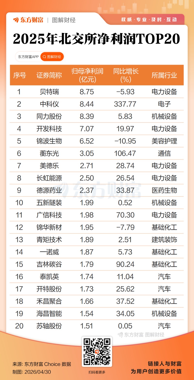 北交所而言,贝特瑞、中科仪、同力股份位居利润榜前三位,2025年归母净利润分别为8.75亿元、8.44亿元、8.39亿元。