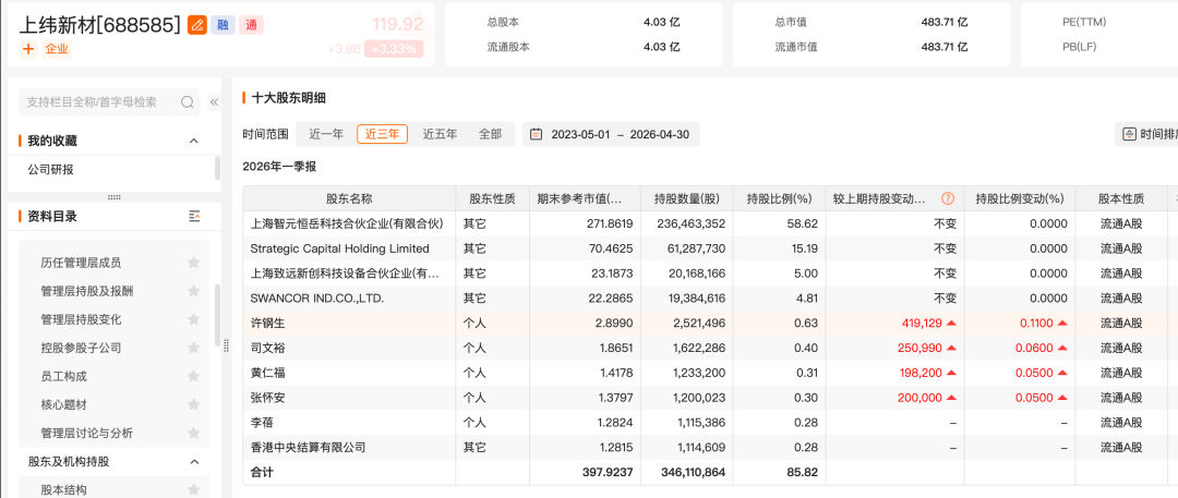 备受市场关注的是,上纬新材一季度末的前十大流通股东中,出现了李蓓的身影。截至一季度末,李蓓新进该公司前十大流通股东名单,持股数量为111.54万股,期末持股市值为1.28亿元。
