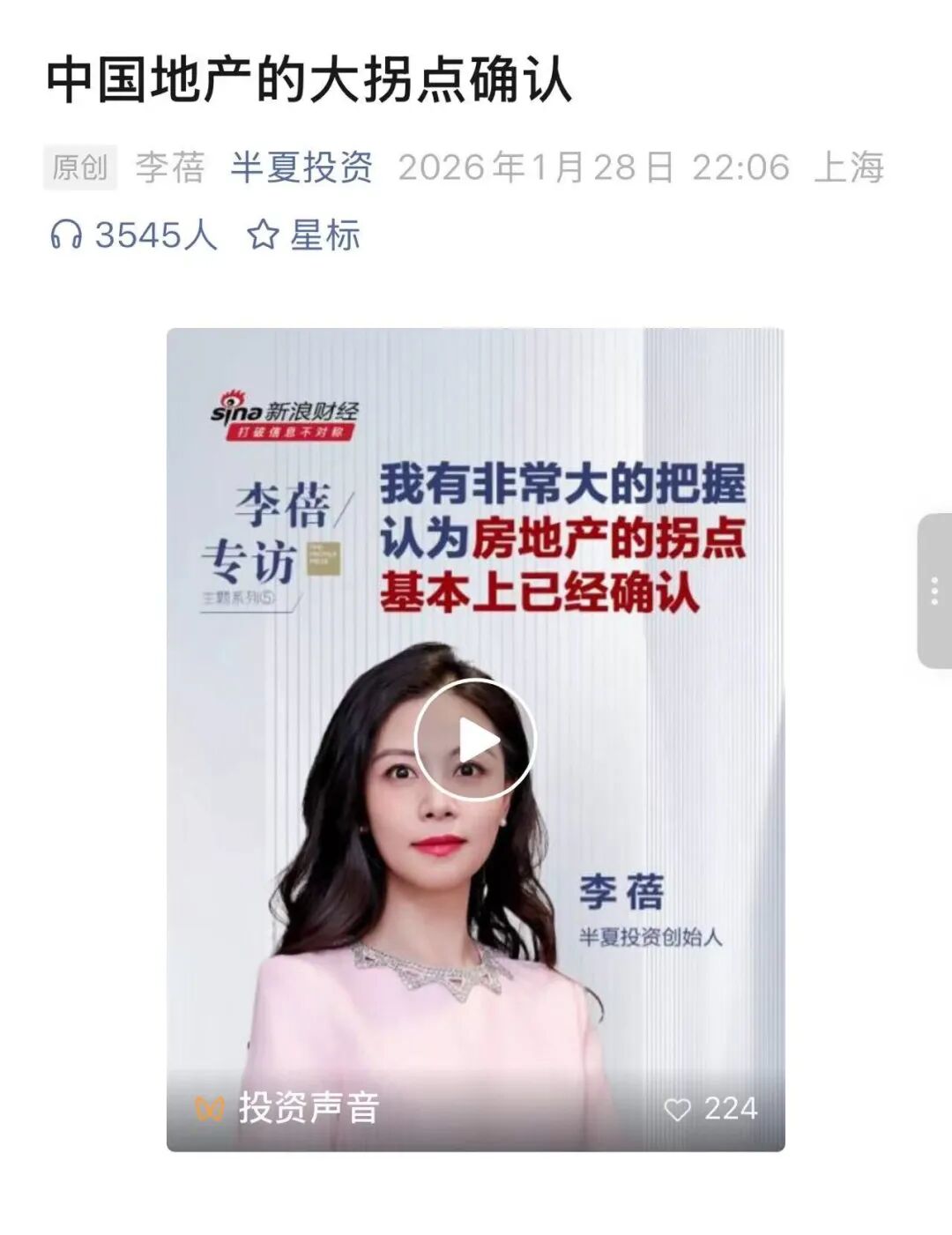 今年1月,李蓓在半夏投资公众号发布观点称,中国地产的大拐点确认。