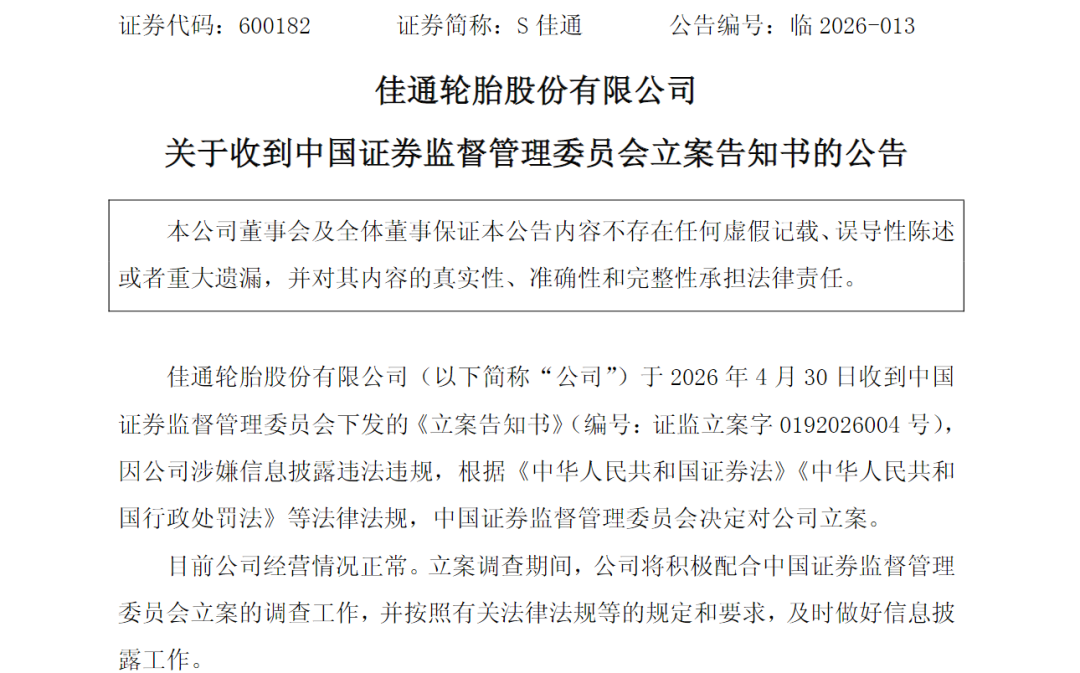4月30日晚,S佳通(600182)发布公告称,公司于2026年4月30日收到中国证监会下发的《立案告知书》,因涉嫌信息披露违法违规,根据相关法律法规,证监会决定对公司立案。目前公司经营正常,立案调查期间,将积极配合调查并履行信息披露义务。