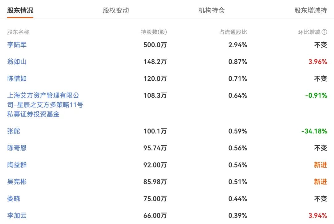 前十大流通股股东持股情况方面,李陆军以500万股的持股数量位居流通股榜首位,持股比例2.94%。翁如山、陈惜如分别持股148.2万股、120万股。陶益群、吴宪彬新进前十大流通股股东榜,分别持股92万股、85.98万股。